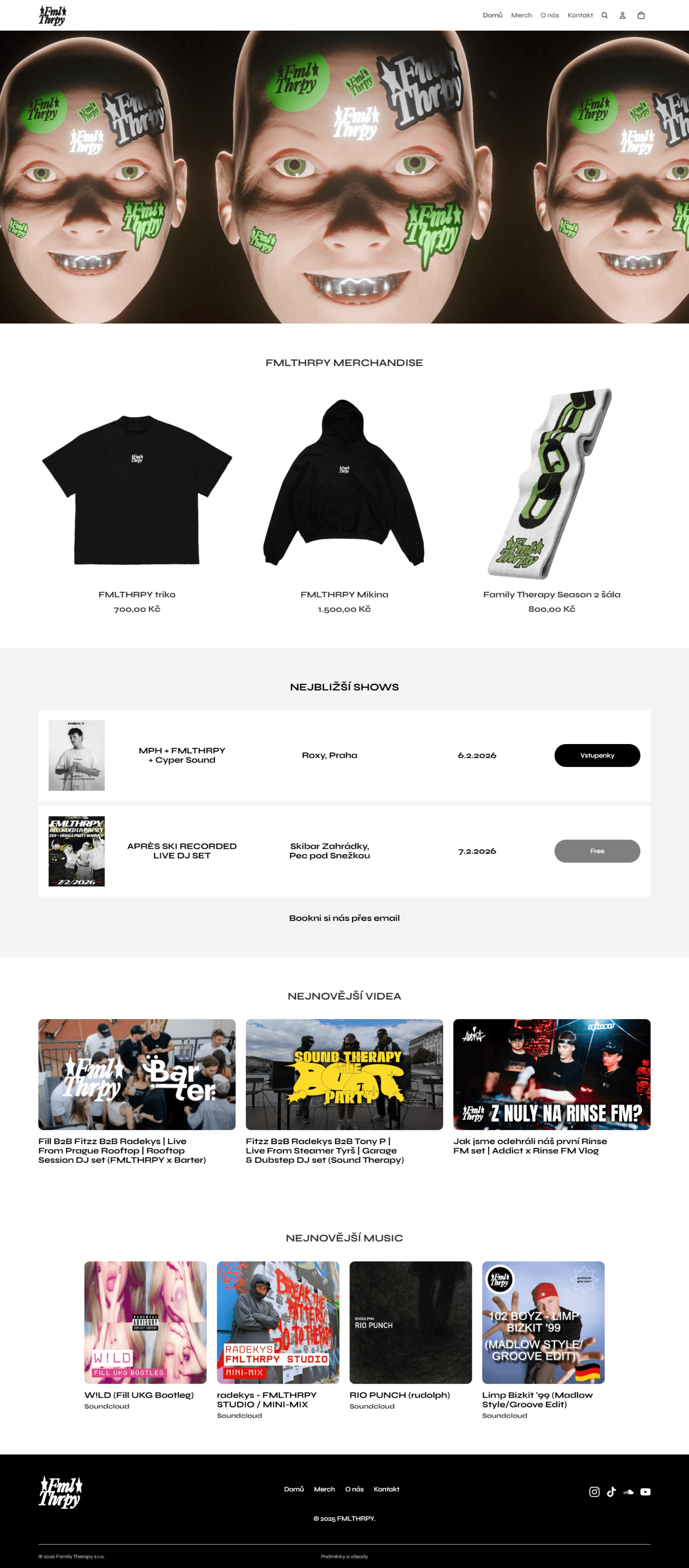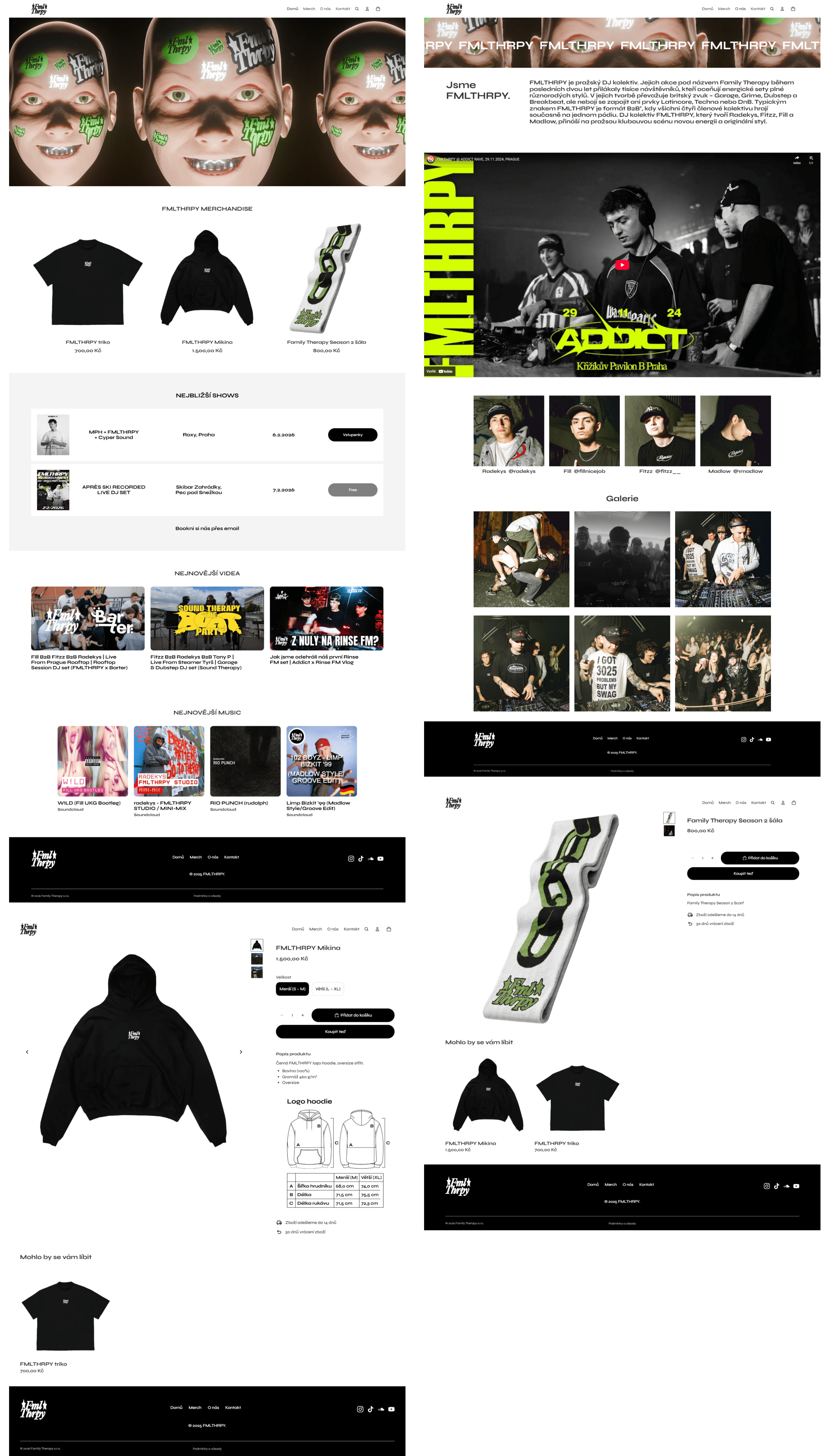 Pro djs z FMLTHRPY jsem vytvořil eshop s webovou prezentací. FMLTHRPY za mnou přišli s tím, že chtějí vytvořit eshop, díky kterému budou prodávat svůj merch. Já jim nabídnul řešení vytvořit eshop i s informativní webovou prezentací. Pro takový projekt jsem zvolil tvorbu na Shopify, které mi přišlo nejintuitivnější v úpravě webu a prodávání merche.
